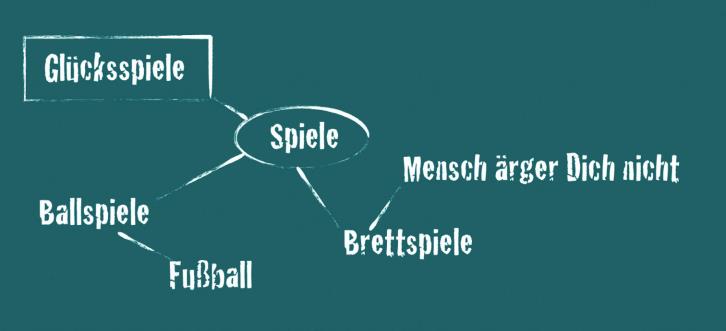 In die Mitte der Tafel wird das Wort „Spiele“ geschrieben und umkreist. Vom Zentral-